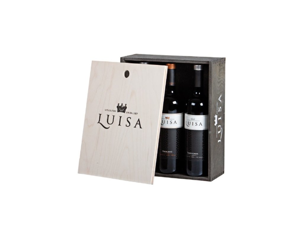 Dřevěný box v přírodním provedení s výsuvným víkem na 3 láhve. Na víku i na boku krabice je vypáleno logo vinařství Luisa. Víko, které je ve světlém přírodním provedení zajímavě kontrastuje s krabicí, která je namořena tmavě. Ruční výroba, jednoduché a elegantní.